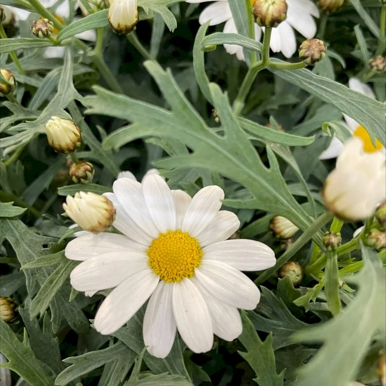 Sne hvide blomster med gul midte. Bør pilles for visne blomster, for at fremme dannelsen af nye knopper.