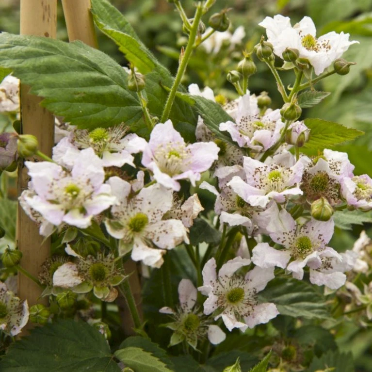 Brombærbusken får små hvide blomster i forsommeren, senere saftige, sorte bær. Storfrugtet og let syrlig.